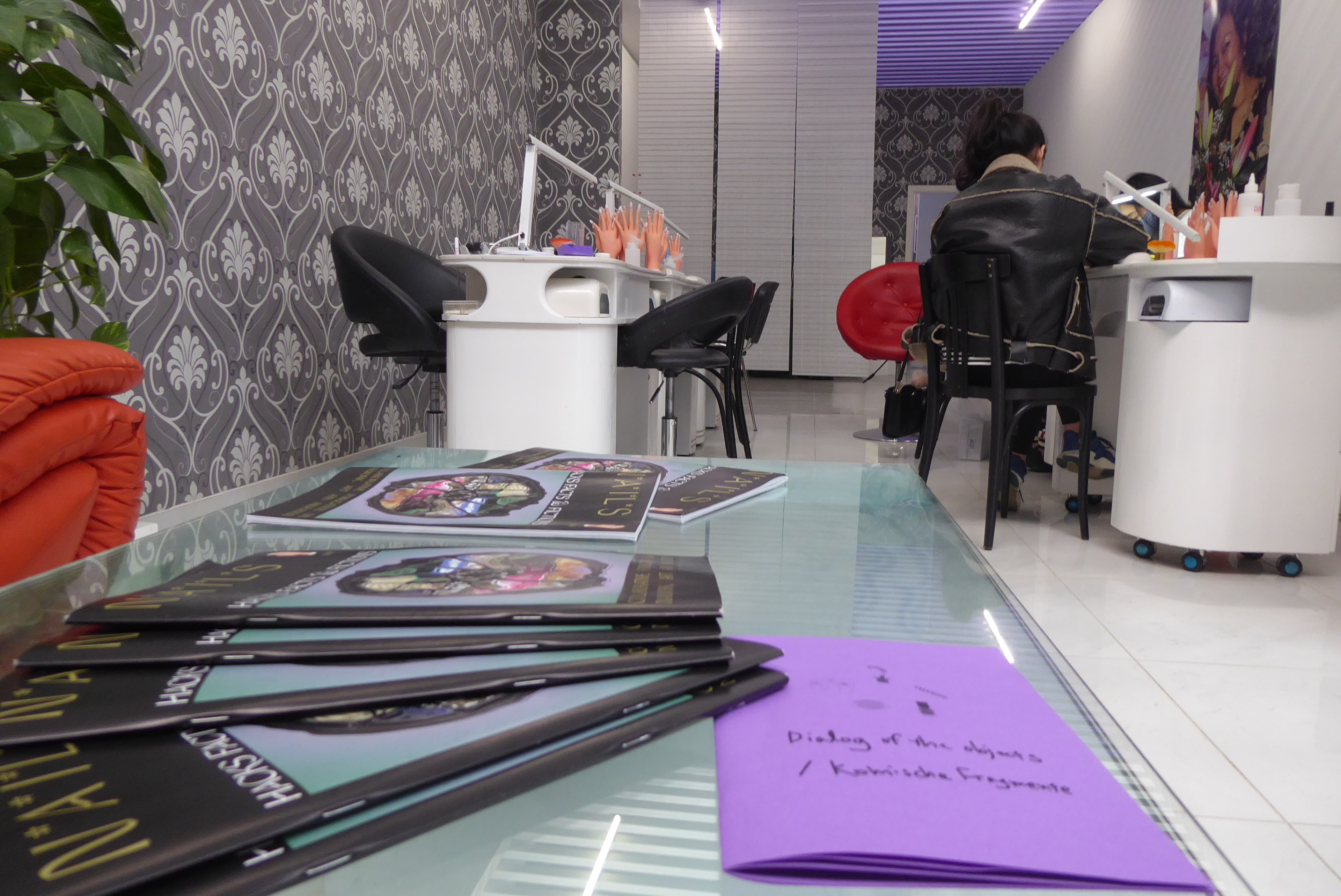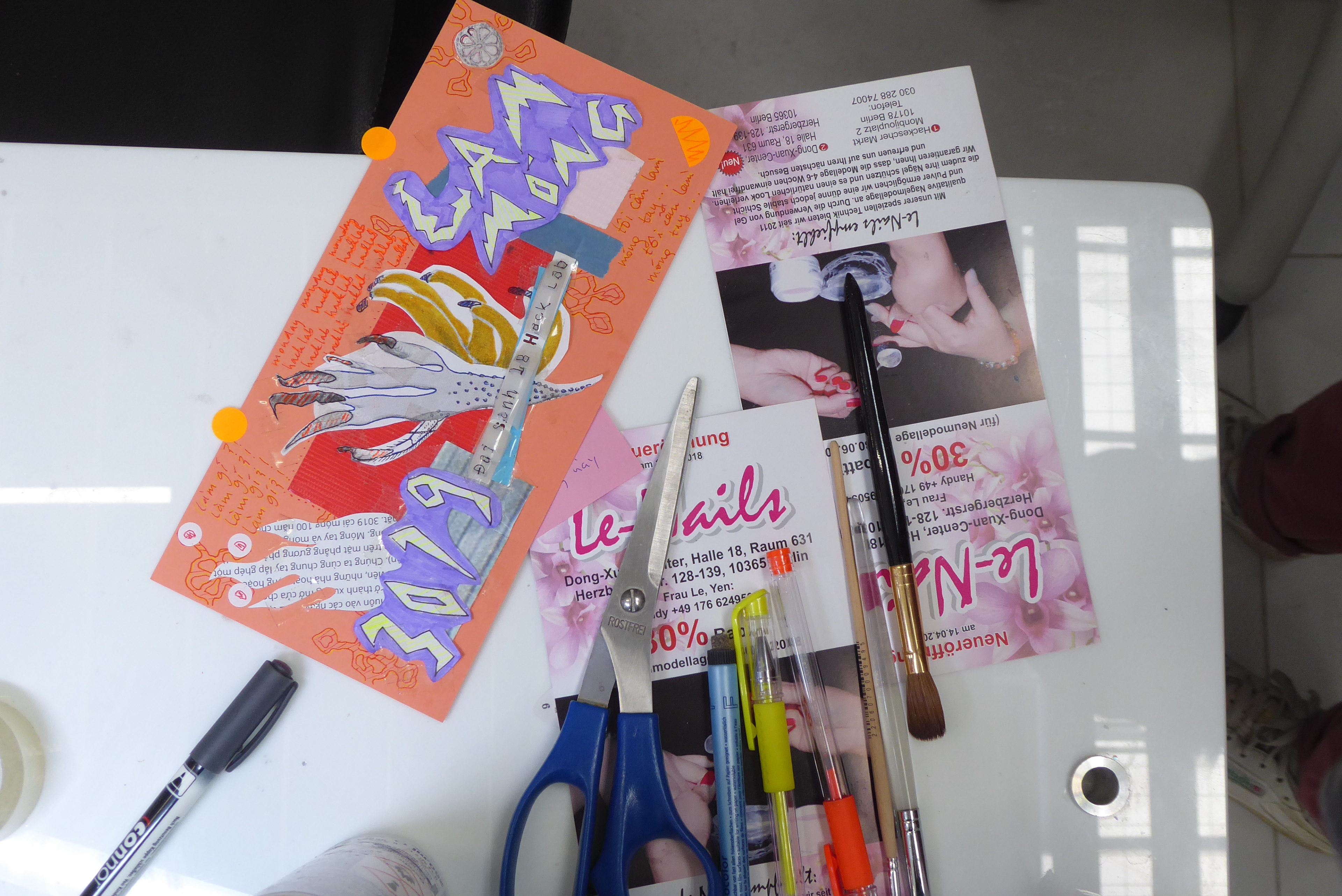 Every Monday, the reflective surface of a manicure table in the nail design school in Don Xuan Center Hall 18 is transformed into a hack lab for a few hours, where virtual reality, live contact and visions of the future overlap. Using 3D scanning, collages, storytelling, activist and queer nail art, the various participants come into contact with each other. Hybrid objects are created that convey the participants’ visions of the future and experiences, as well as a Vietnamese-German dictionary for beauticians and customers with vocabulary for encounters at eye level and solidarity-based exchange.